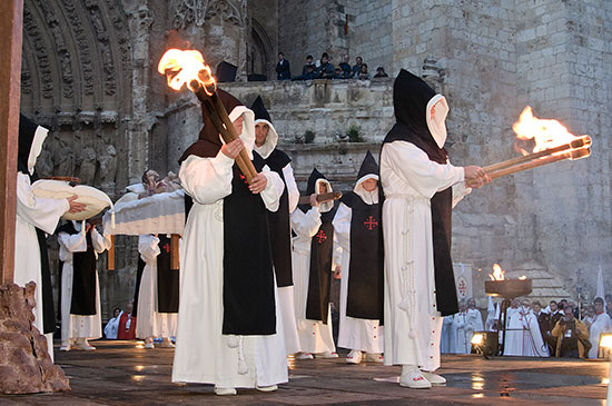 Túnica blanca con botonadura roja y la cruz del Santo Sepulcro bordada en el pecho izquierdo; capillo blanco con la cruz del Santo Sepulcro bordado a la altura del pecho; capa blanca de tipo manteo con ribete rojo y la cruz del Santo Sepulcro bordada a la izquierda; cordón de lana blanca, guantes blancos y calzado blanco con hebillas rojas